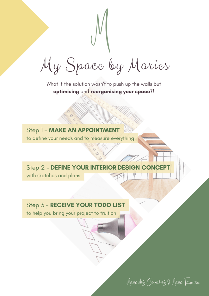 – An active and attentive accompaniment to put your objectives into practice directly in your home, whether it is only a cupboard or your entire living space (not limited to your cellar or attic).
